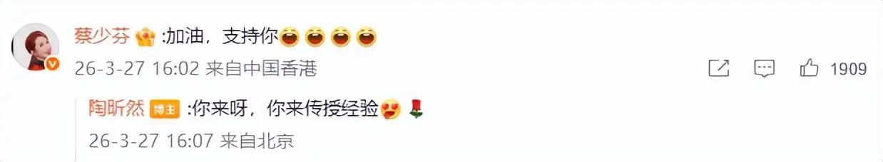 不仅如此,在陶昕然个人社交账号下,“皇后娘娘”蔡少芬也在评论区为她加油,剧粉这次太满足了。
