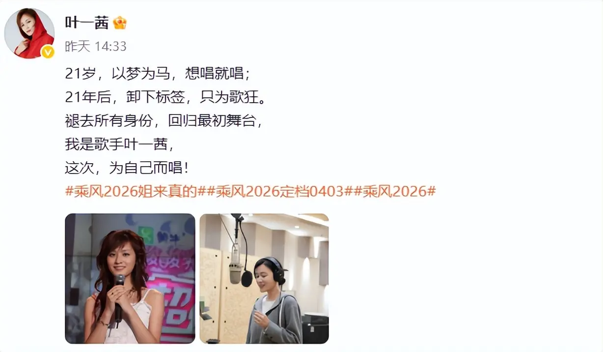 不过,在某博上,叶一茜官宣去节目的评论区却没有当年的“好姐妹”们前来鼓气。